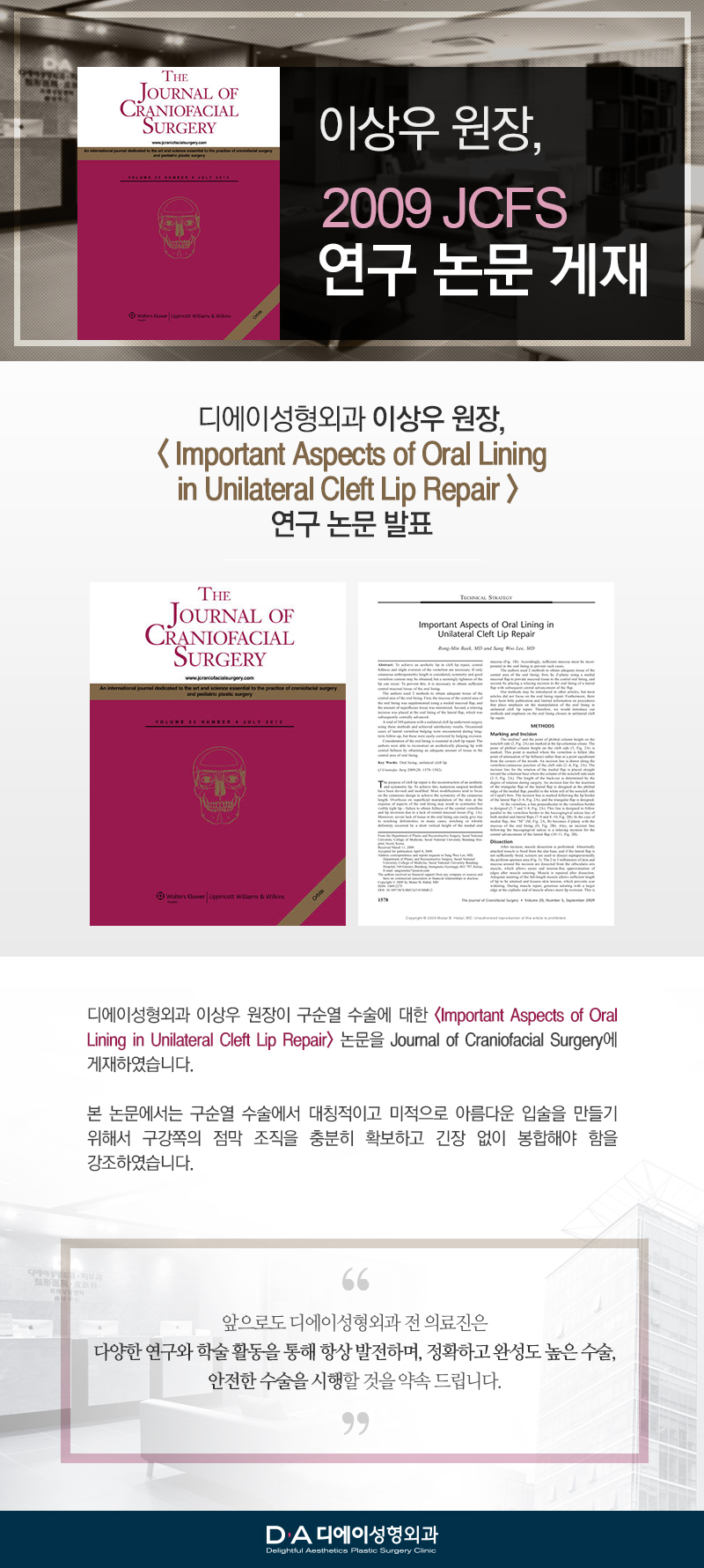[논문발표] 이상우 원장, 'Important Aspects of Oral Lining in Unilateral Cleft Lip Repair' 연구 논문 발표