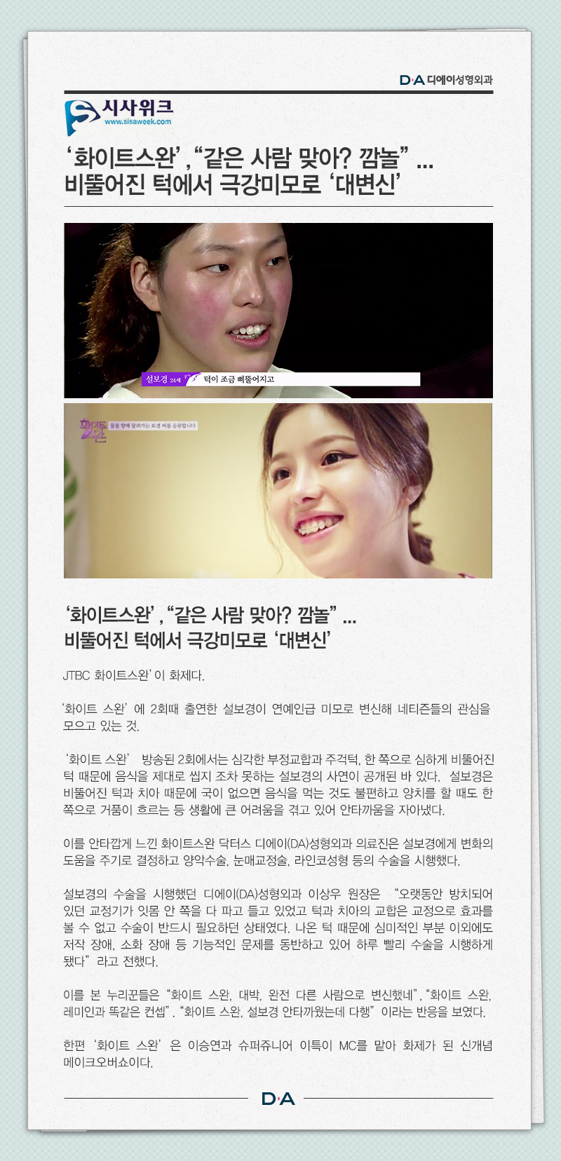 '화이트스완', "같은 사람 맞아? 깜놀"... 비뚤어진 턱에서 극강미모로 '대변신'